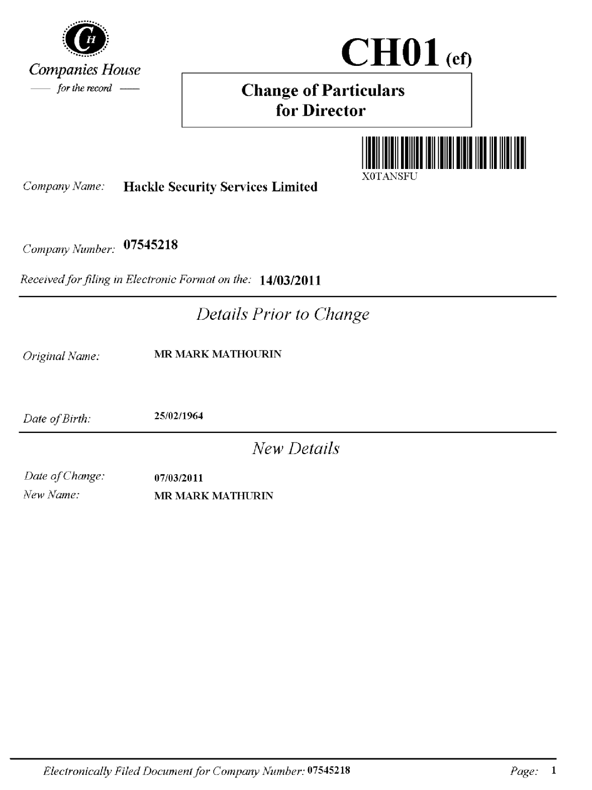 15/03/2011 CH01 DIRECTOR’S CHANGE OF PARTICULARS / MR MARK MATHURIN / 07/03/2011