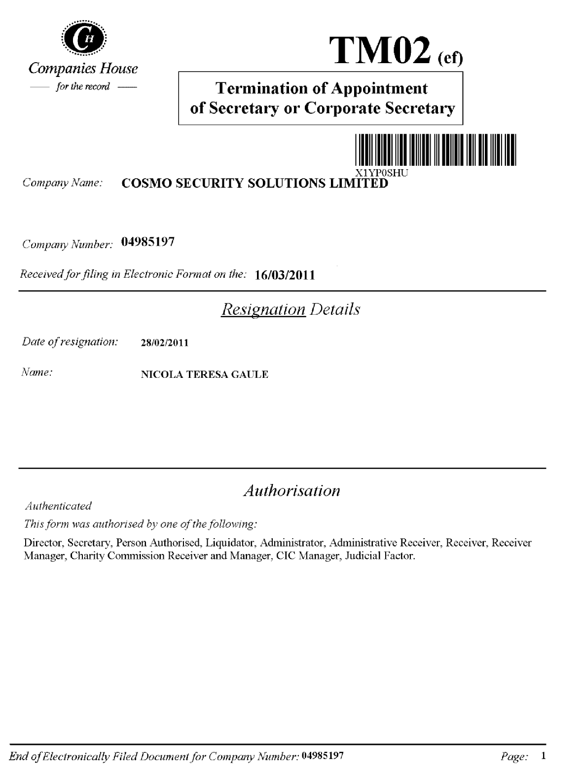 16/03/2011 TM02 APPOINTMENT TERMINATED, SECRETARY NICOLA GAULE