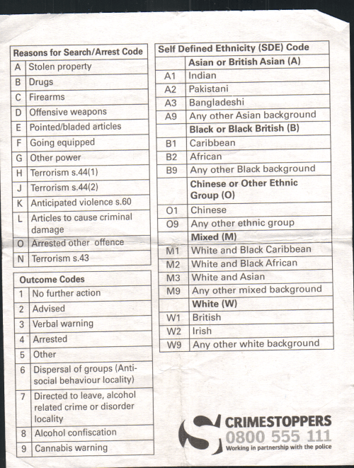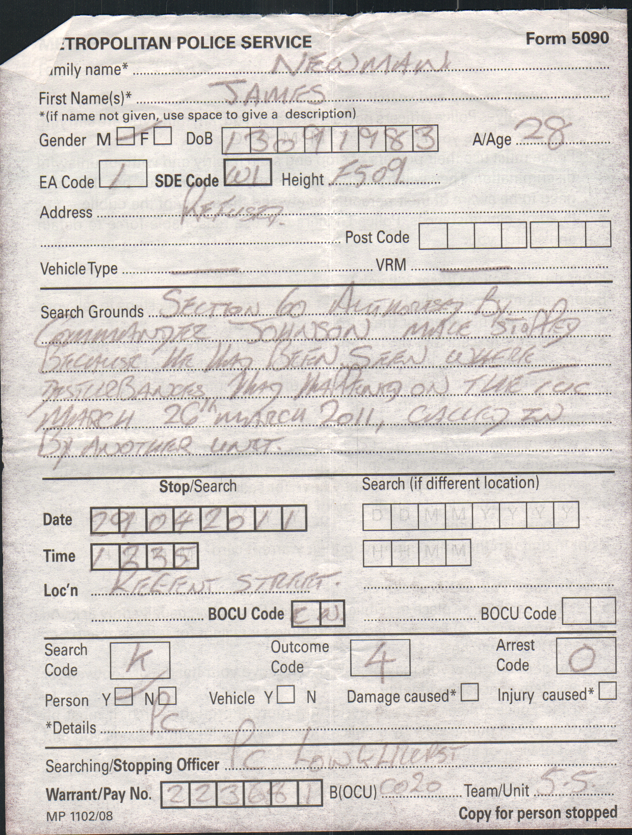 4. Abuse of the Section 60 order. From the Met’s own website:”There are, however, occasions when the police can search anyone in a certain area, for example when there is evidence that serious violence has taken place or may take place, (Powers under S60 Criminal Justice and Public Order Act 1994). The officer should explain this to you and must be searching for items to be used in connection with violence”