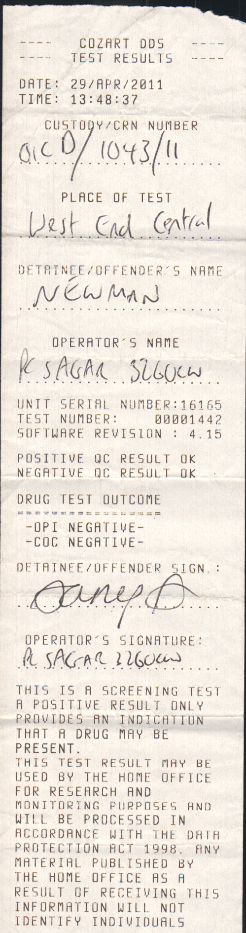 When I arrived at West End Central I was informed by a police officer that this is where they took the Krays brothers. Whilst in the station I noticed some faces that I recognised from Soho Square. It took some time for the duty seargent to process me through but once he was done I was taken to have my photos taken. I then had to go for another set of photos with a lady. She must have been bored because she had a few reading books and magazines on the desk. I was then taken to the fingerprint machine and had all my prints taken. Once my fingerprints had been taken I was made to suck on a cotton bud until it tirned blue. I then had my DNA taken. The results of the drugs test was ready. It was an obvious negative and the officer seemed pleased with the result.