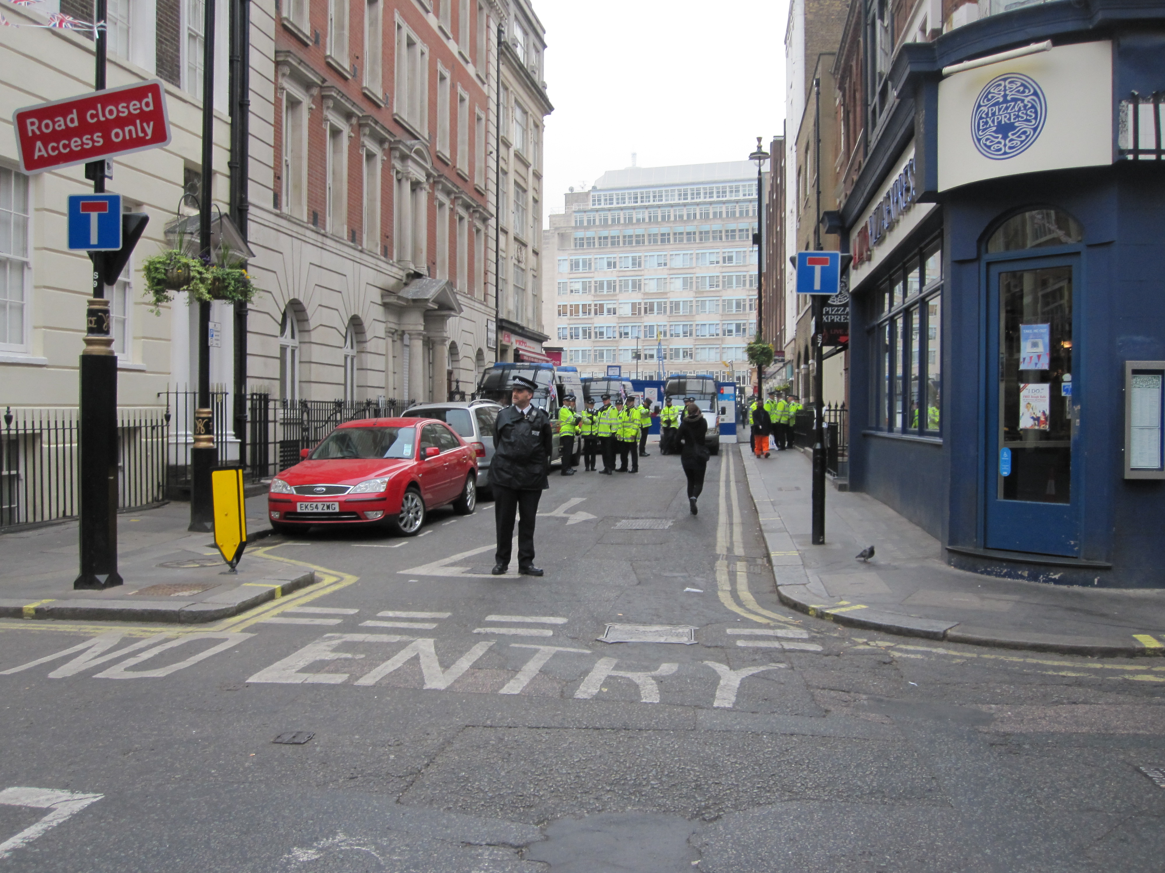Ten people in Soho Square, including one eccentric fellow in a tabard who appeared to be wearing a colander on his head, a guitar player, a couple of teenagers, and a gaggle of paparazzi could turn into a “full scale riot”? Come on, give me a break, that’s a load of horse manure and you know it. As for the right to protest, if you can only use it when the government approves of it, it’s not a right.