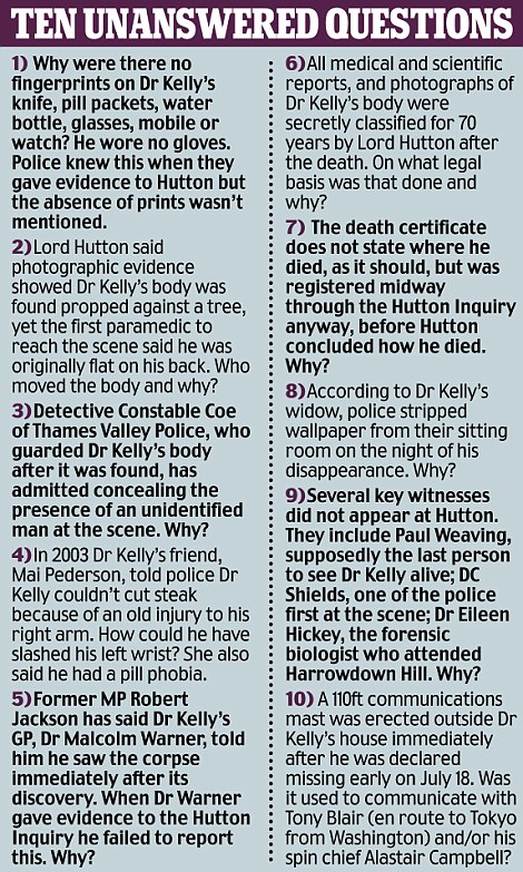 “Four successive governments have sought to obscure the truth of what happened. The cover-up could not be more obvious.” PM David Cameron also suggested last month a full inquest was not needed, saying the Hutton report had been “fairly clear”. And Labour’s Shadow Solicitor General Catherine McKinnell yesterday backed the Government’s position, agreeing that there was a “lack of new compelling evidence” that Dr Kelly had not committed suicide.