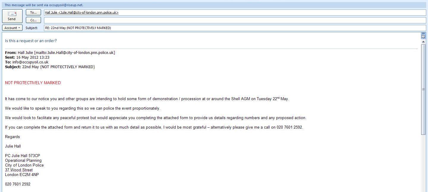 The City of London Police has unsuccessfully attempted to illicit information regarding the upcoming global event – Occupy Oil the Sequel (RIP Shell). PC Julie Hall (573CP) sent Occupy Oil an e-mail requesting the number of people who are attending this event along with the proposed action. Also sent with the e-mail was two PDF Application Forms. One being for a Procession protest (Appendix 1) and the other being for a Static protest.