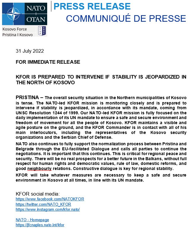 A Nato peacekeeping force has said it is “prepared to intervene” amid rising tensions between Kosovo and Serbia. The pledge comes as Kosovo police said they closed two border crossings in the volatile north after local Serbs blocked roads and fired shots at police in protest. Locals were enraged by an order to switch Serb car number plates to Kosovan ones within two months, sparking protests. Nato’s Kosovo Force (KFOR) said in a statement: “The Nato-led KFOR mission is monitoring closely and is prepared to intervene if stability is jeoparadised in accordance with its mandate coming from UN SC Resolution 1244 of 1999. KFOR will take whatever measures are necessary to keep a safe and secure environment in Kosovo at all times, in line with its UN mandate.” Fourteen years after Kosovo declared independence from Serbia, some 50,000 Serbs living in the north use number plates and documents issued by Serbian authorities, refusing to recognise institutions under the capital, Pristina. Kosovo has been recognised as an independent state by more than 100 countries but not by Serbia or Russia.