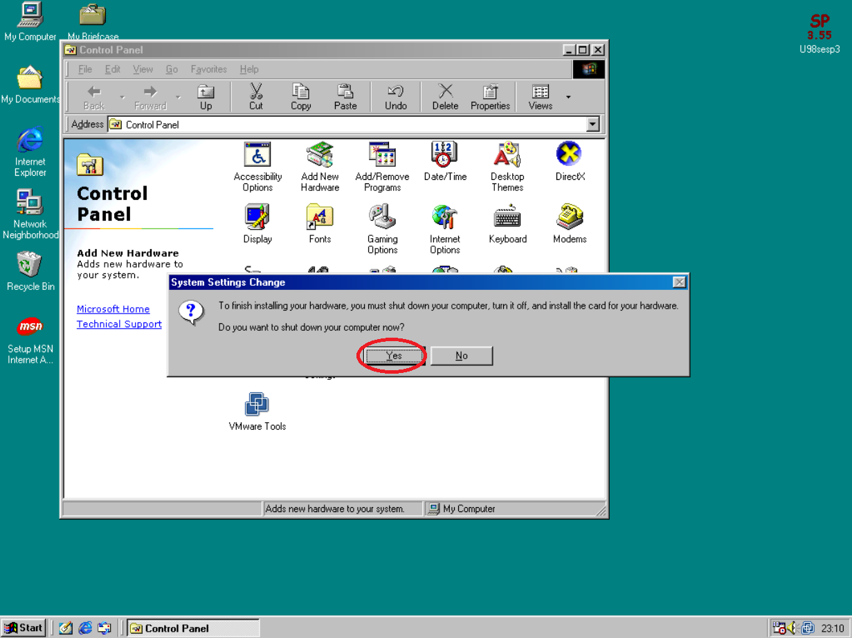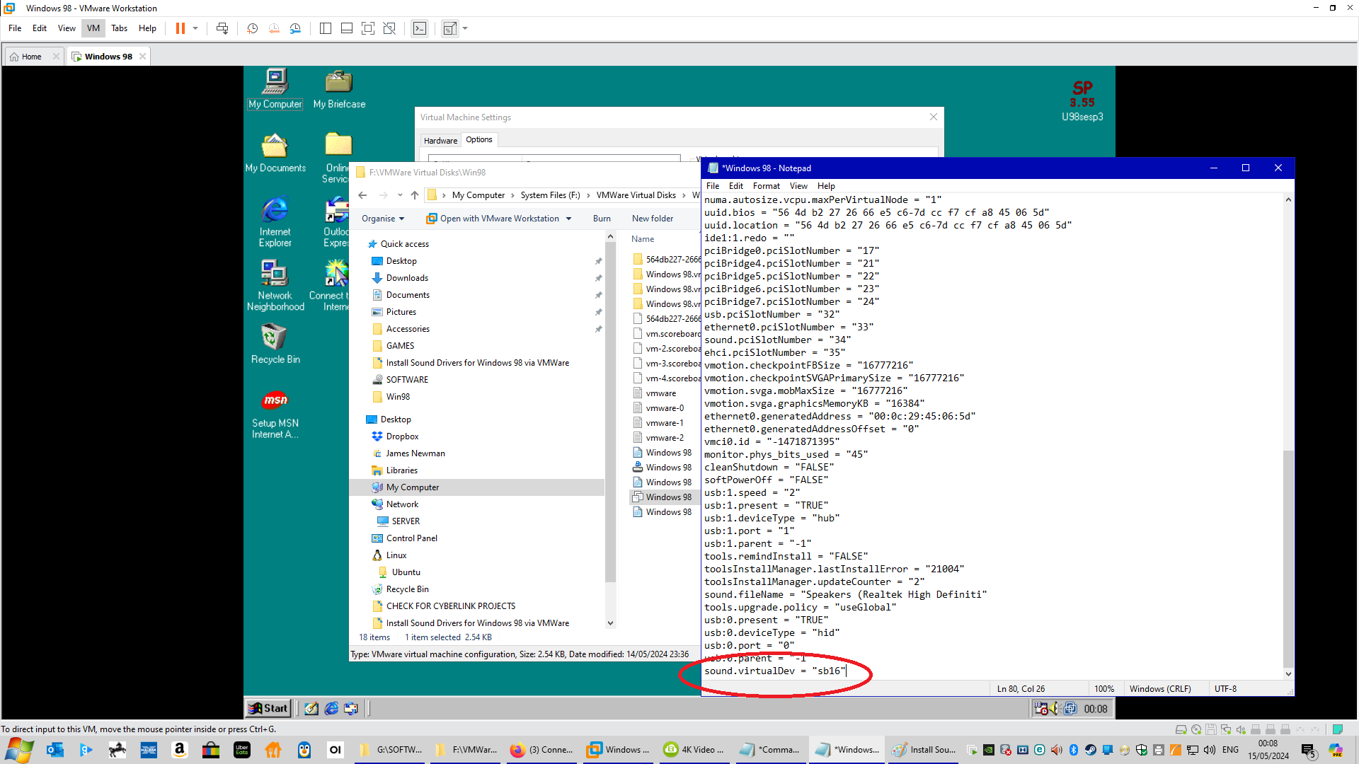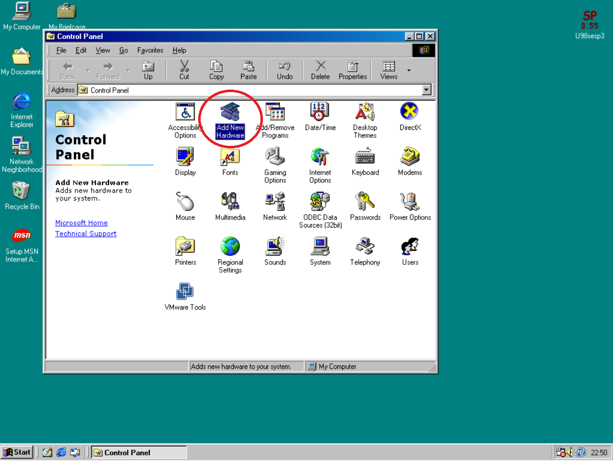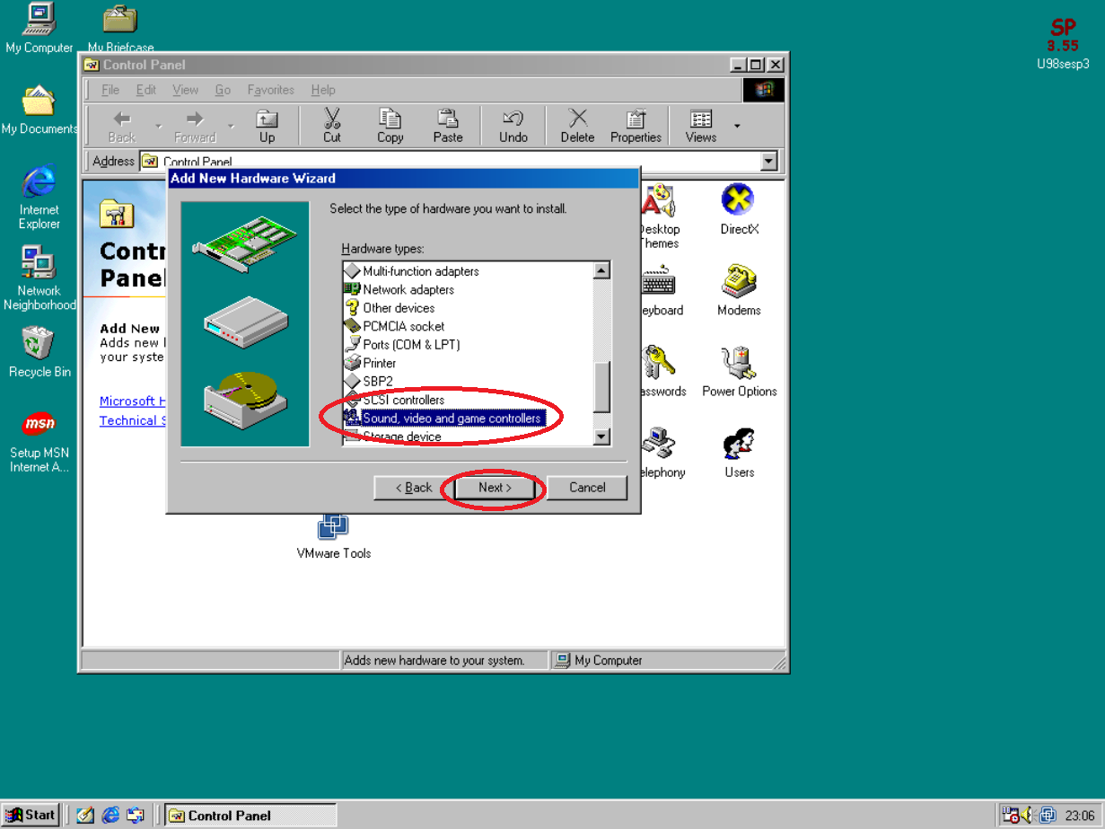 The following instructions and screenshots will help you to correctly setup the sound drivers for Windows 98SE in VMWARE. This will give you sound that isn’t distorted or choppy using drivers that are already present in Windows 98.